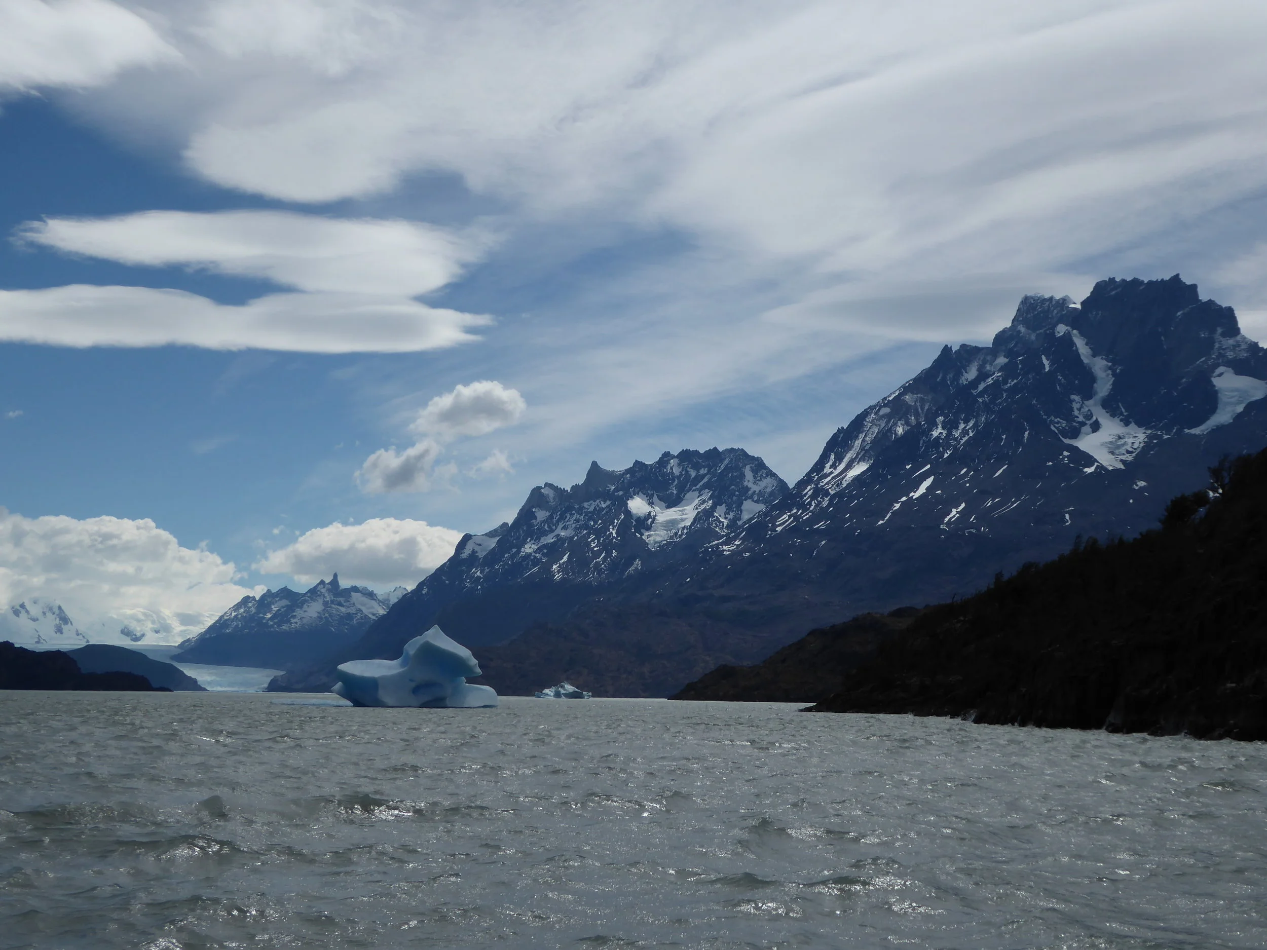 Eventually, our tour takes us to Torres del Paine National Park in Chile where we all fill up our cameras' memory cards with iconic images of its peaks, hoping that if we take enough photos, we will somehow fit the experience into our electronic devices--a futile effort. We arrive at our hotel in the Park after 8 pm, the sun still shining brightly on these long spring days far to the south. Since we are here for several nights, this is our opportunity to finally break away from the regiment of group travel! After our first full-night's sleep in several weeks, we wake up lazily to the sound of the wild, refreshing Patagonian wind, brilliant sunshine, and a sky filled with a multitude of clouds of different densities and colors. We have a leisurely breakfast (at last) and then take a gorgeous 3-hour hike that rewards us with a better view of the Lago Grey glacier and the many icebergs that float upon the lake.